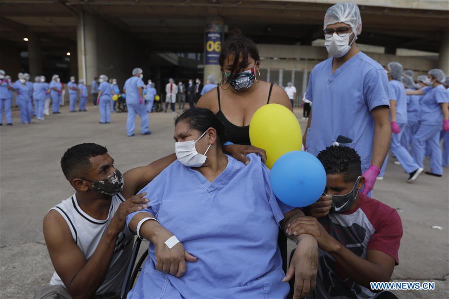 A patient is discharged from a temporary hospital at the National Stadium in Brasilia, Brazil, Oct. 15, 2020. The temporary hospital is closed on Thursday. Since its establishment on May. 22, the hospital has received more than 1,800 COVID-19 patients. (Photo by Lucio Tavora/Xinhua)