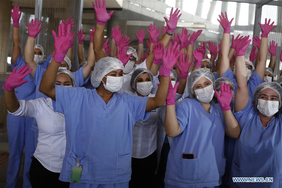 Health workers celebrate the closure of a temporary hospital at the National Stadium in Brasilia, Brazil, Oct. 15, 2020. The temporary hospital is closed on Thursday. Since its establishment on May. 22, the hospital has received more than 1,800 COVID-19 patients. (Photo by Lucio Tavora/Xinhua)