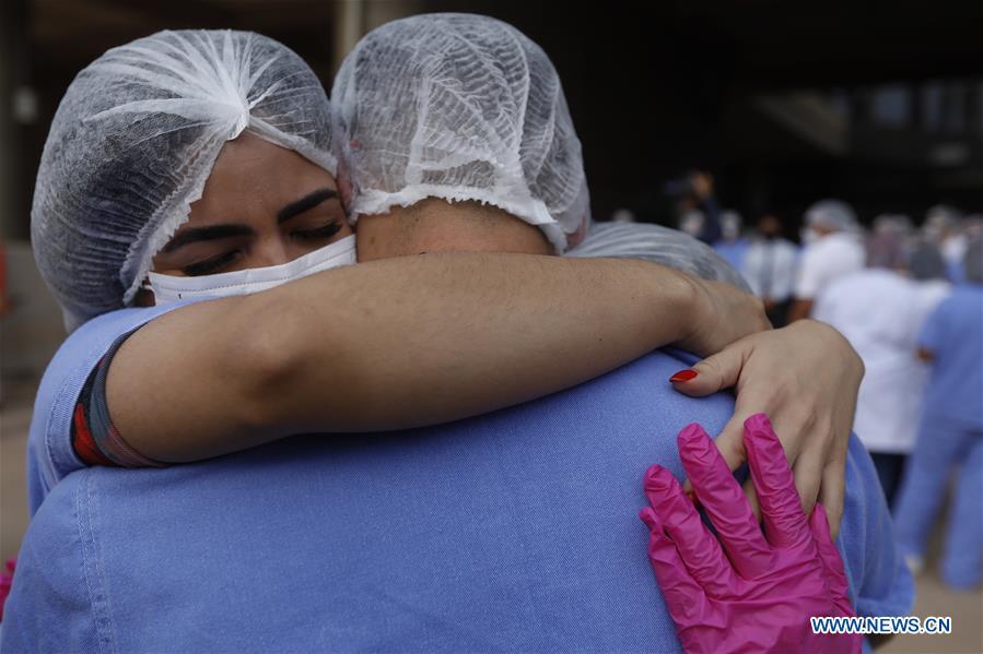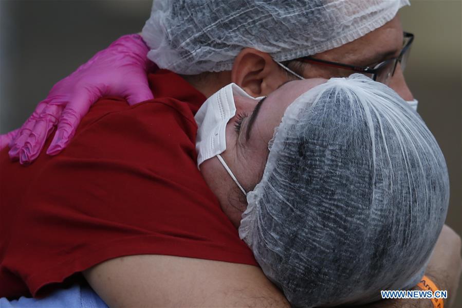 Health workers hug each other to celebrate the closure of a temporary hospital at the National Stadium in Brasilia, Brazil, Oct. 15, 2020. The temporary hospital is closed on Thursday. Since its establishment on May. 22, the hospital has received more than 1,800 COVID-19 patients. (Photo by Lucio Tavora/Xinhua)