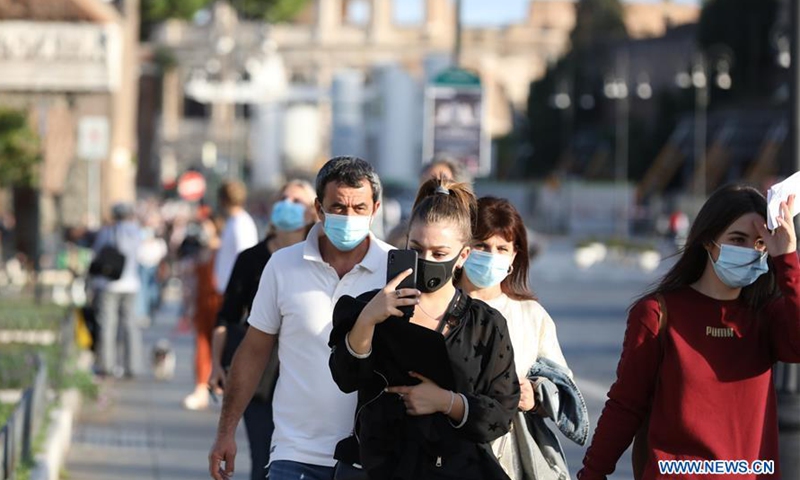 People wearing face masks walk on Via dei Fori Imperiali in Rome, Italy, Oct 6, 2020. Five southern regions of Italy have introduced mandatory mask laws, even for people in open spaces. And the government has announced that the national state of emergency, first put into place on Jan. 31, would be extended "at least" until its one-year anniversary.Photo:Xinhua
