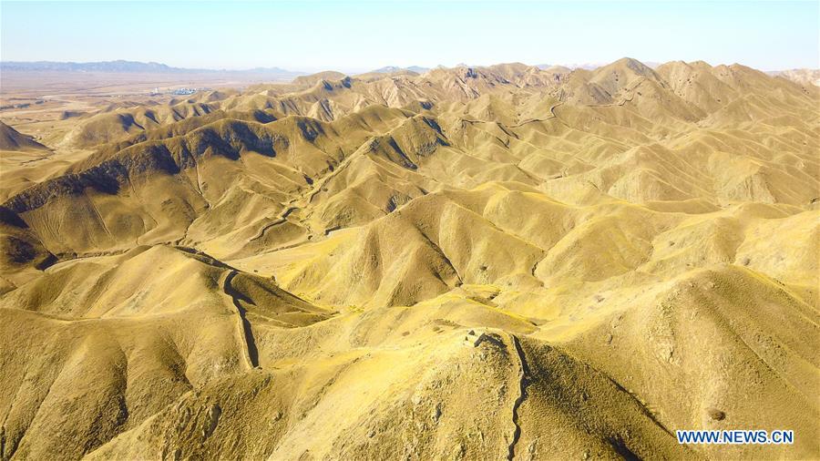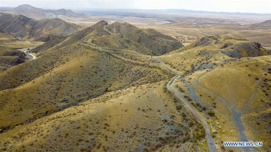Aerial photo shows the ruins of the Great Wall built in the Qin (221 BC to 206 BC) and Han (206 BC to 220 AD) dynasties, in Urad Front Banner in Bayannur, north China's Inner Mongolia Autonomous Region, Oct. 16, 2020. (Xinhua/Peng Yuan)