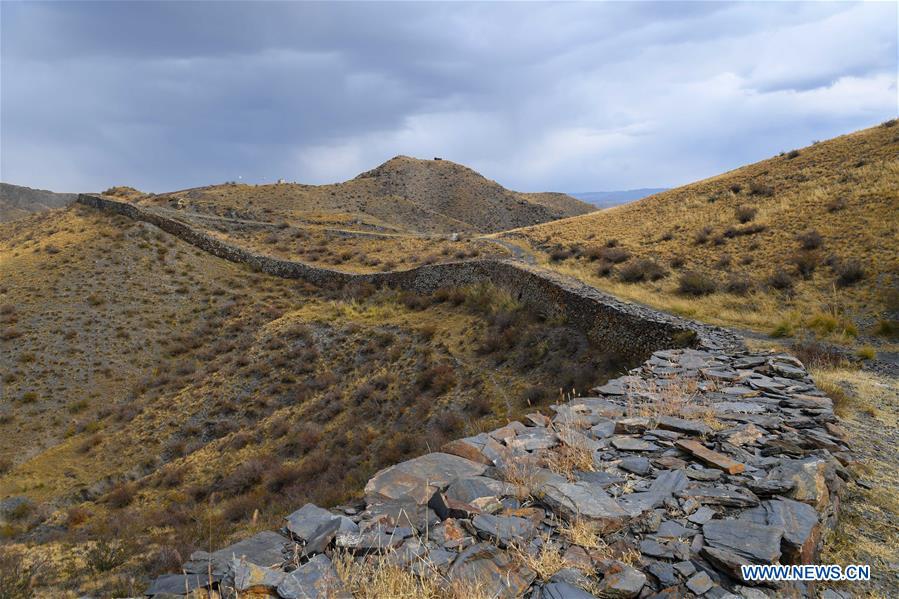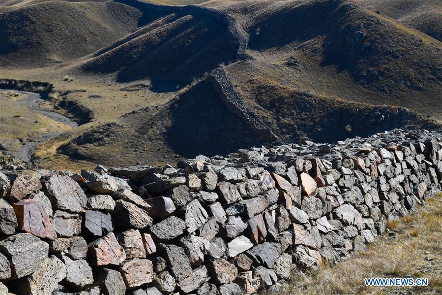 Photo shows the ruins of the Great Wall built in the Qin (221 BC to 206 BC) and Han (206 BC to 220 AD) dynasties, in Urad Front Banner in Bayannur, north China's Inner Mongolia Autonomous Region, Oct. 16, 2020. (Xinhua/Peng Yuan)