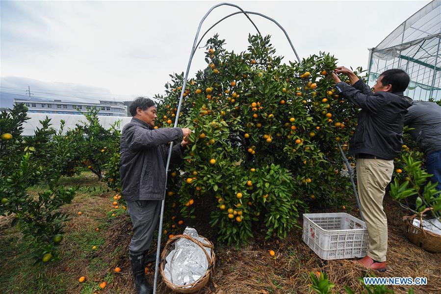 Citrus growers pick citrus fruit at a citrus planting base in Sandu Town of Jiande, east China's Zhejiang Province, Oct. 16, 2020. Citrus fruit in Sandu Town of Jiande has entered into the harvest season. (Xinhua/Xu Yu)
