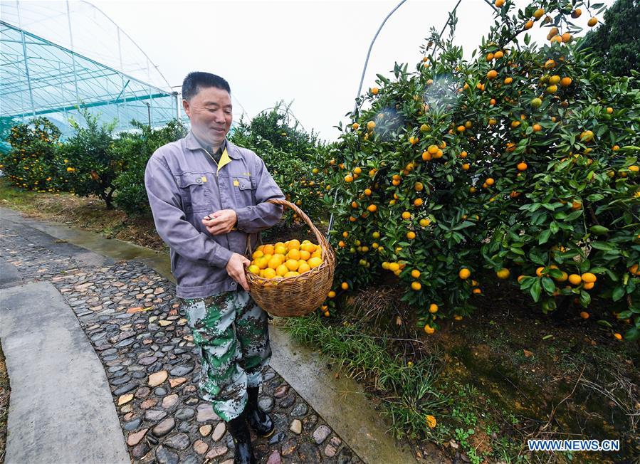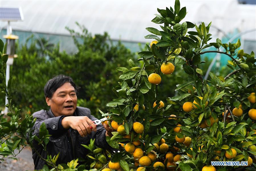 A citrus grower picks citrus fruit at a citrus planting base in Sandu Town of Jiande, east China's Zhejiang Province, Oct. 16, 2020. Citrus fruit in Sandu Town of Jiande has entered into the harvest season. (Xinhua/Xu Yu)
