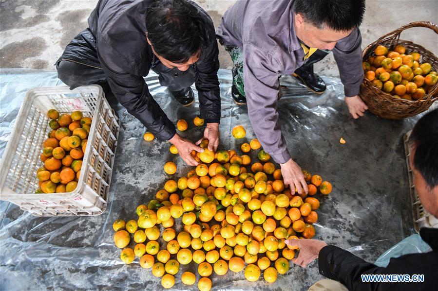 Citrus growers sort newly-harvested citrus fruit at a citrus planting base in Sandu Town of Jiande, east China's Zhejiang Province, Oct. 16, 2020. Citrus fruit in Sandu Town of Jiande has entered into the harvest season. (Xinhua/Xu Yu)