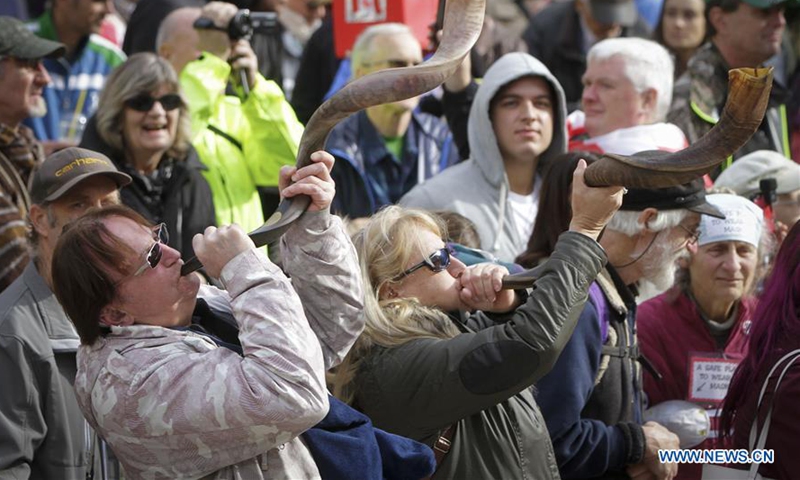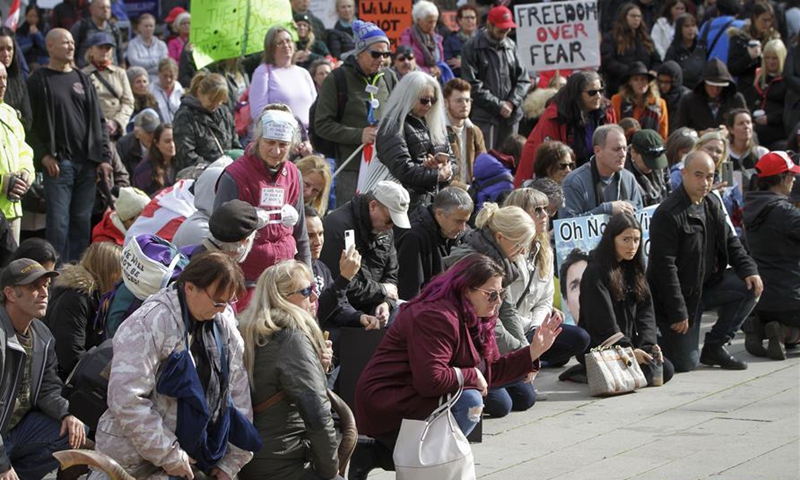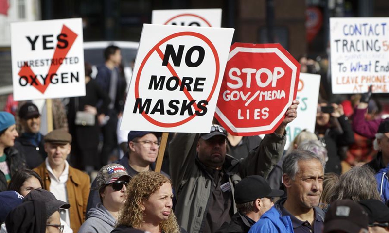 Protesters without face masks attend an anti-restriction rally in Vancouver, British Columbia, Canada, on Oct. 17, 2020. Thousands of protesters took part in the anti-coronavirus-restriction rally to express their disapproval over a number of topics including lockdowns, mask mandates, quarantine, travel bans and social distancing. (Photo by Liang Sen/Xinhua)