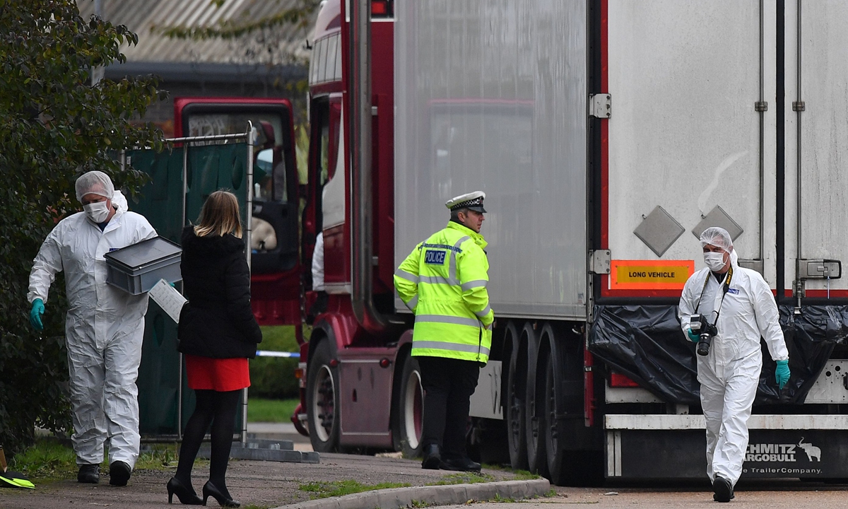 British Police forensics officers work on lorry, found to be containing 39 dead bodies, at Waterglade Industrial Park in Grays, east of London on October 23, 2019. Photo: VCG