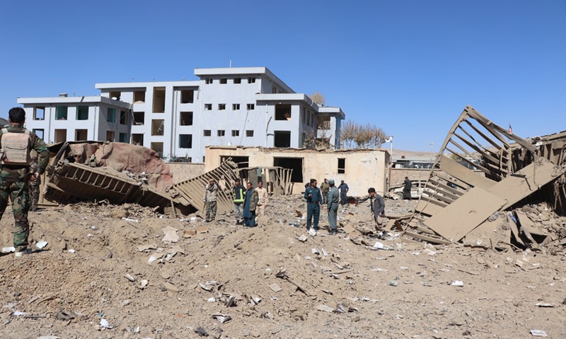 Photo taken on Oct. 18, 2020 shows the explosion site after a blast struck the provincial police office in Firoz Koah, capital of Afghanistan's western Ghor province. (Str/Xinhua)