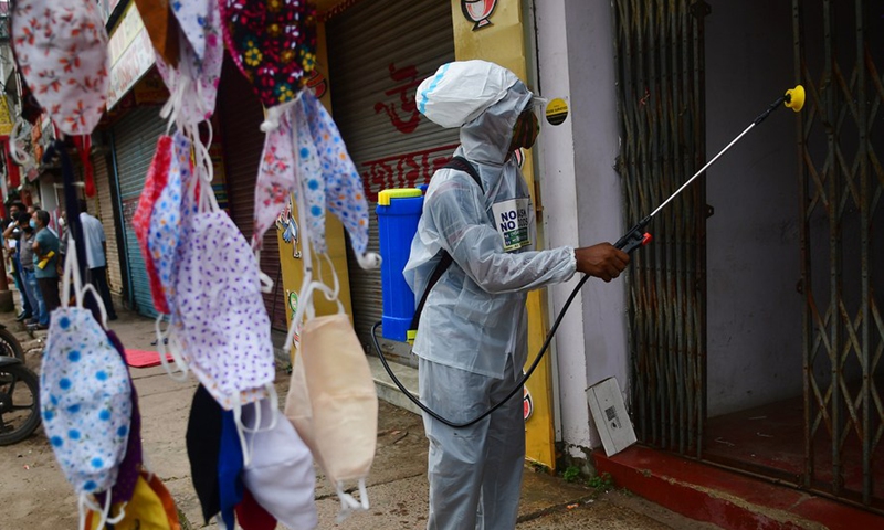 A worker sanitizes the door of a shop at a market in Agartala, the capital city of India's northeastern state of Tripura, Oct. 18, 2020. (Str/Xinhua)