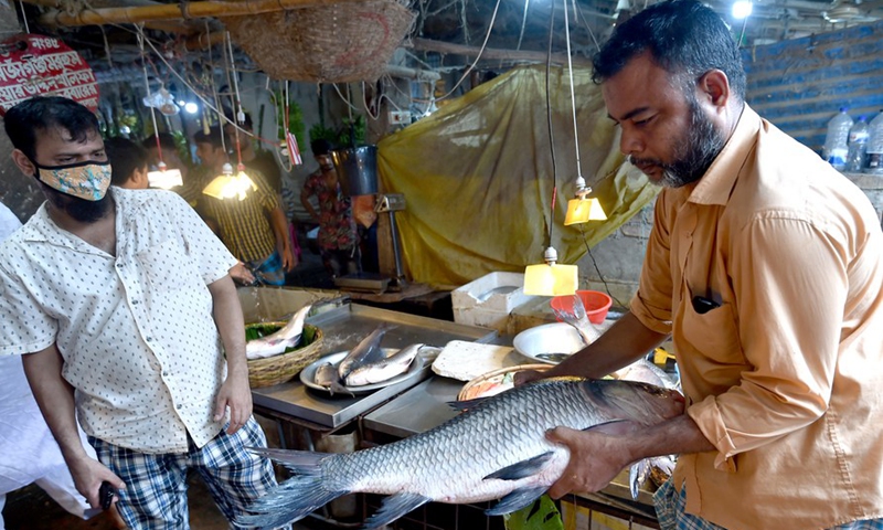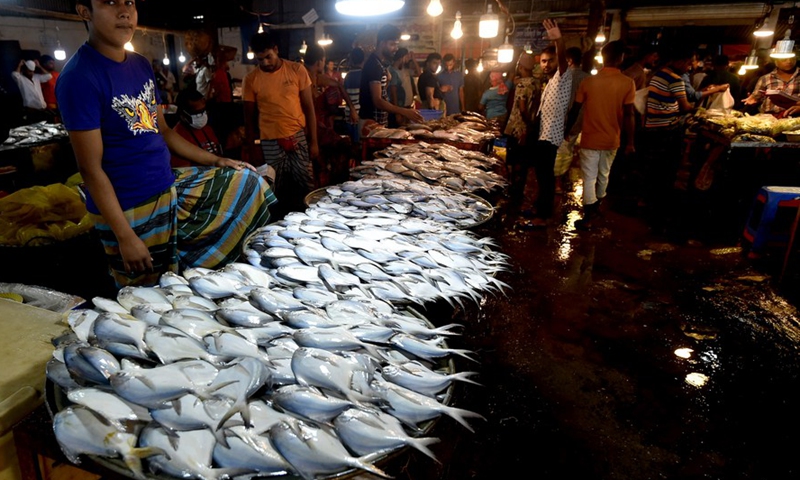 People buy fishes at a mega marketplace in Dhaka, Bangladesh on Oct. 18, 2020. (Xinhua)
