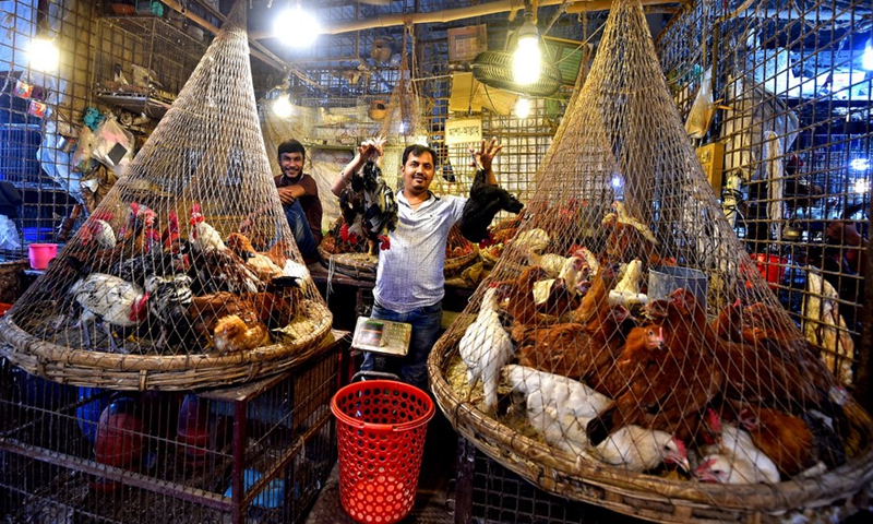 A vendor shows chicken on sale at a mega marketplace in Dhaka, Bangladesh, Oct. 18, 2020. (Xinhua)