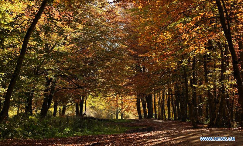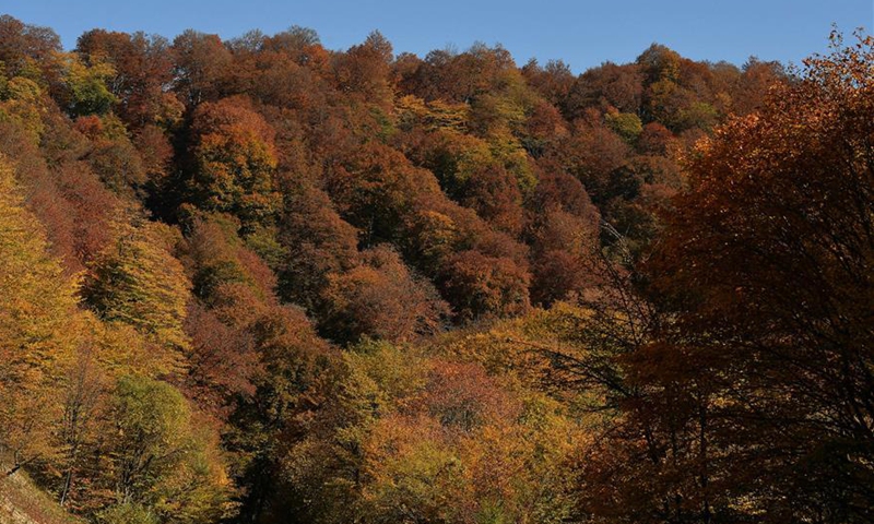 Photo taken on Oct. 17, 2020 shows the autumn scene in the Sabaduri Mountain, 35 km north of the capital Tbilisi, Georgia. (Photo by Tamuna Kulumbegashvili/Xinhua)