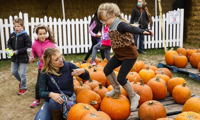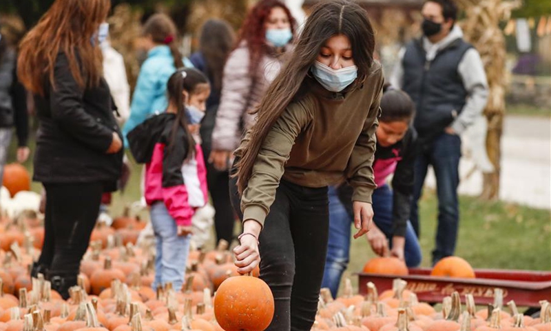 Visitors choose pumpkins at a Pumpkinfest in Lincolnshire, Illinois, the United States, on Oct. 17, 2020. Lots of towns in Illinois are holding pumpkin festivals recently ahead of the Halloween. (Photo by Joel Lerner/Xinhua)