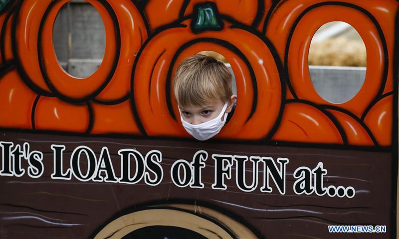 A boy poses for a photo in a cutout of a pumpkin at a Pumpkinfest in Lincolnshire, Illinois, the United States, on Oct. 17, 2020. Lots of towns in Illinois are holding pumpkin festivals recently ahead of the Halloween. (Photo by Joel Lerner/Xinhua)