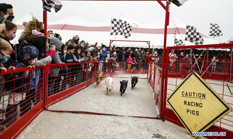 People watch pig race during Didier Farms' Pumpkinfest in Lincolnshire, Illinois, the United States, on Oct. 17, 2020. Lots of towns in Illinois are holding pumpkin festivals recently ahead of the Halloween. (Photo by Joel Lerner/Xinhua)