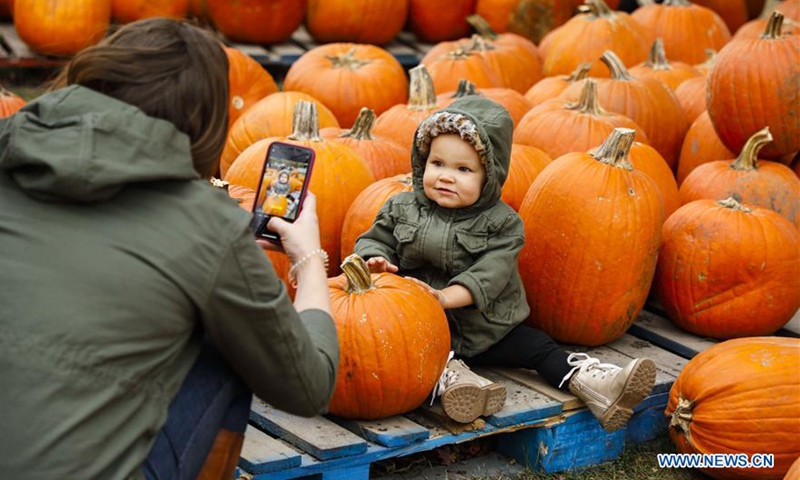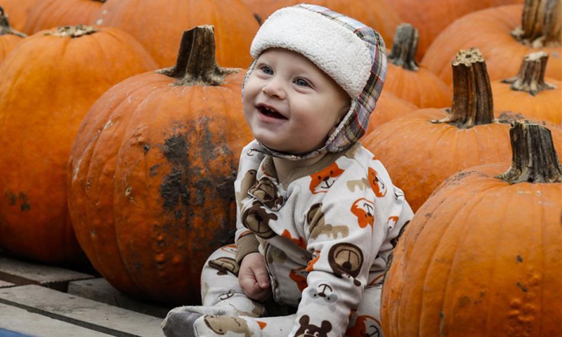 A baby poses for a photo with pumpkins at a Pumpkinfest in Lincolnshire, Illinois, the United States, on Oct. 17, 2020. Lots of towns in Illinois are holding pumpkin festivals recently ahead of the Halloween. (Photo by Joel Lerner/Xinhua)