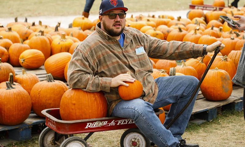 A visitor rests among his pumpkins at a Pumpkinfest in Lincolnshire, Illinois, the United States, on Oct. 17, 2020. Lots of towns in Illinois are holding pumpkin festivals recently ahead of the Halloween. (Photo by Joel Lerner/Xinhua)