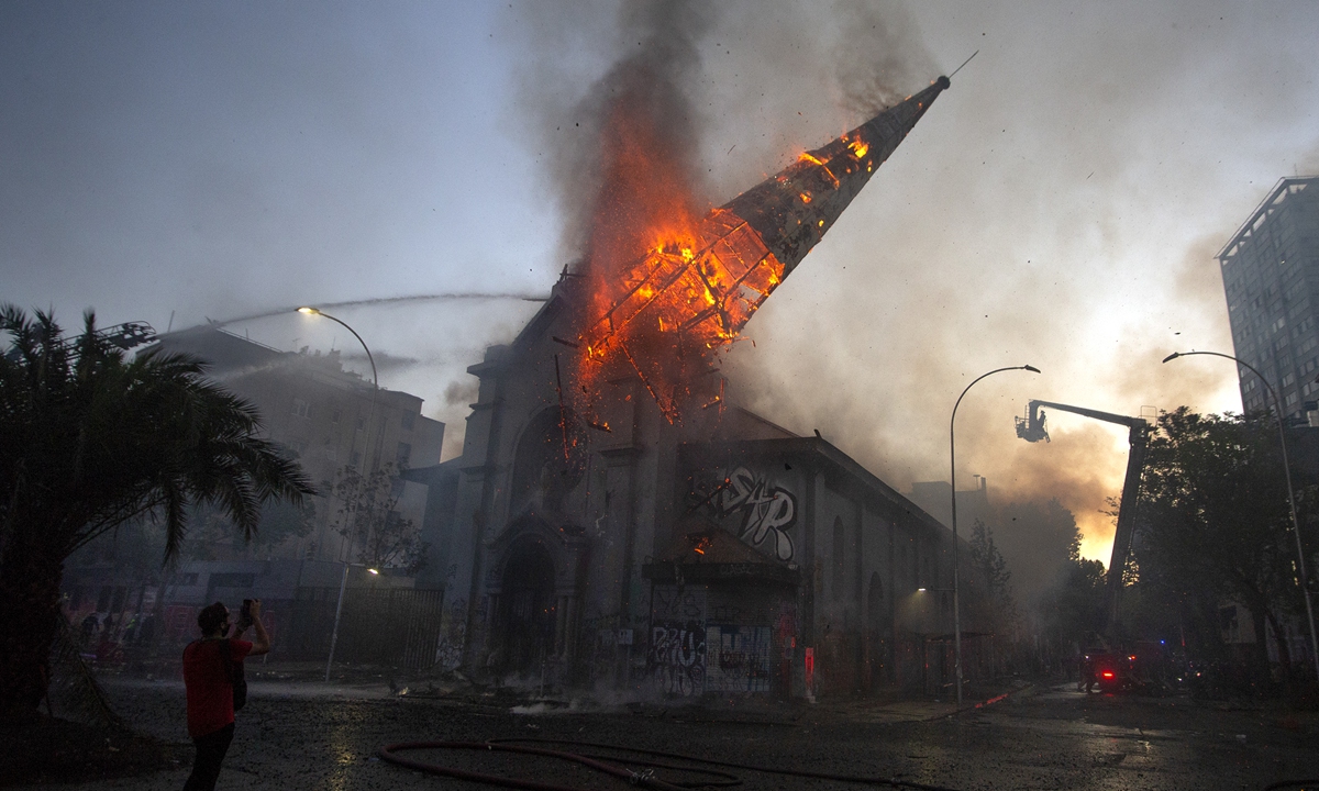 One church close to Plaza Italia was burnt to the ground as hooded protesters cheered, while a second place of worship was looted and also suffered fire damage.