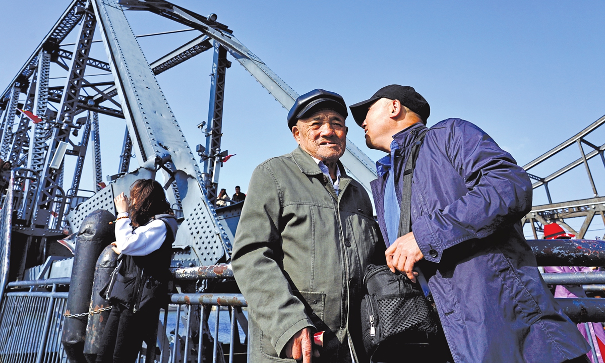 Zhang Fasong (center), 90, visits the Yalu River Broken Bridge accompanied by his son from Daqing, Northeast China's Heilongjiang Province.