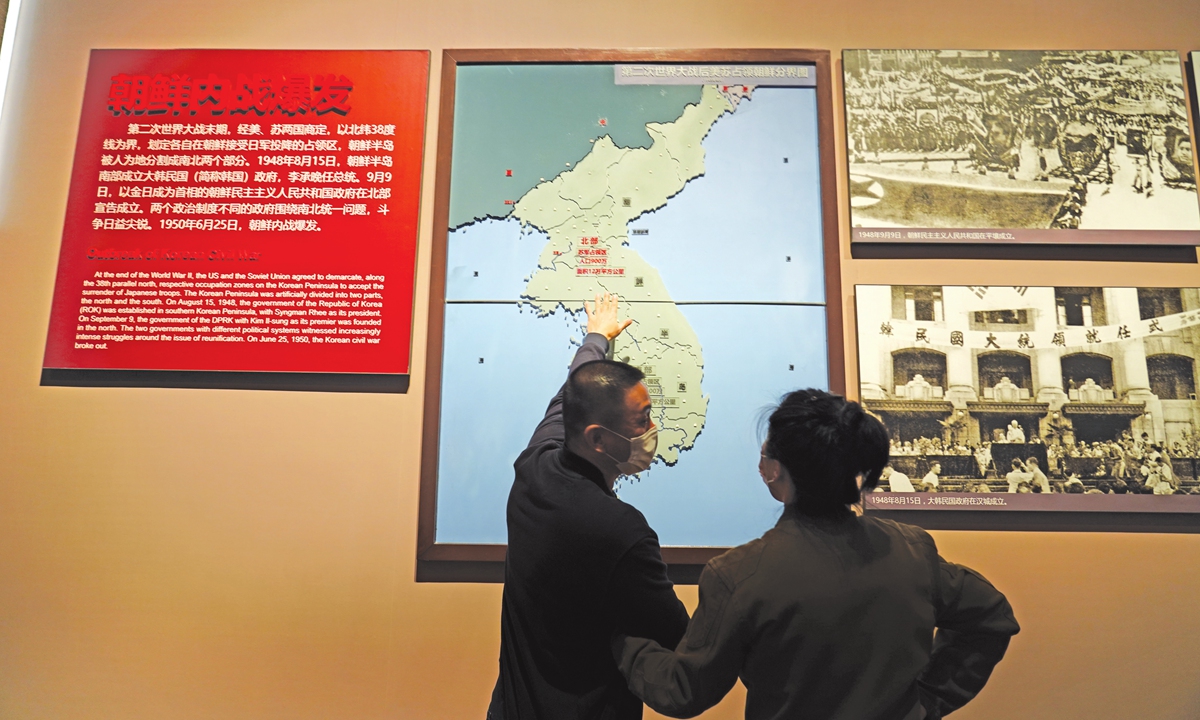 Visitors read a map of Korean Peninsula in the Memorial Hall of the War to Resist US Aggression and Aid Korea in Dandong.