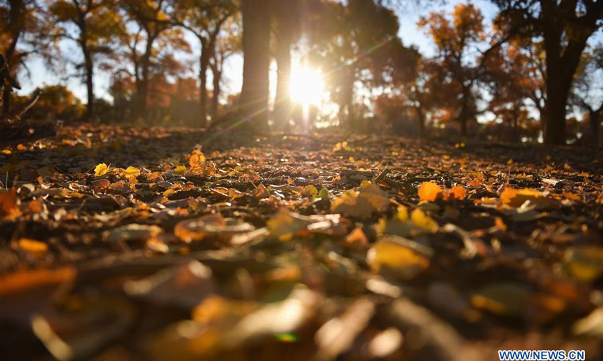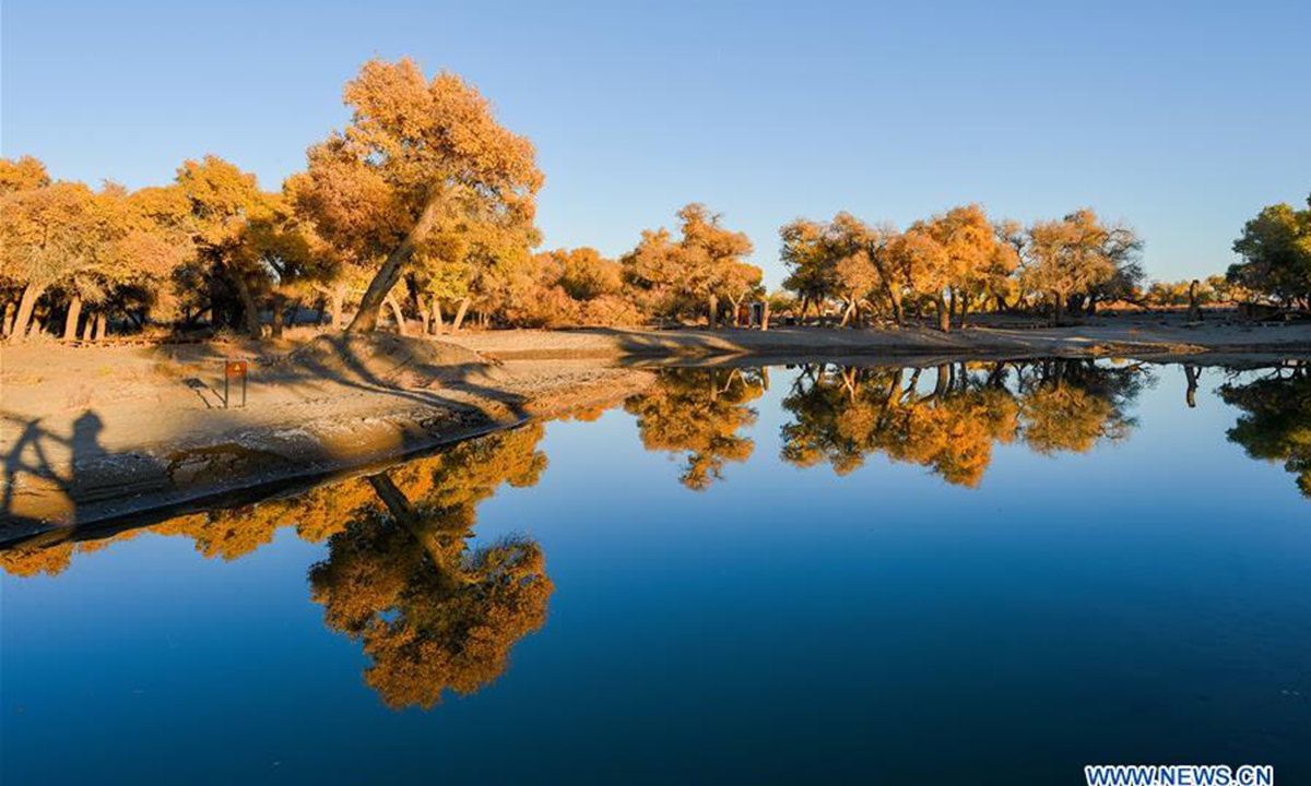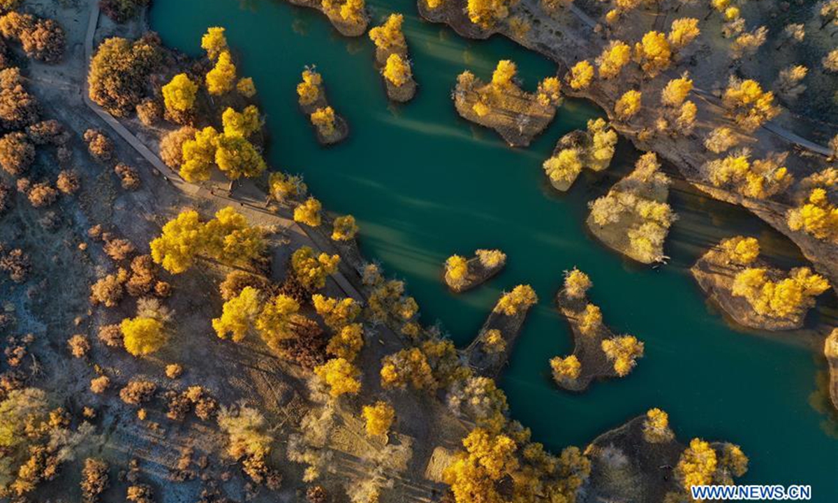 Photo taken on Oct. 18, 2020 shows the autumn scenery of the populus euphratica forest in Ejin Banner, north China's Inner Mongolia Autonomous Region. (Xinhua/Lian Zhen)