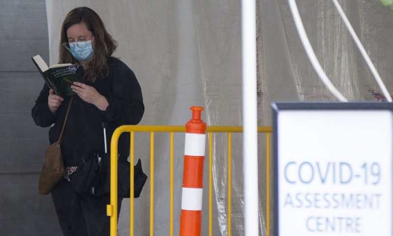 A woman wearing a face mask reads a book as she waits for COVID-19 test outside a COVID-19 assessment center in Toronto, Canada, on Oct. 15, 2020. (Photo by Zou Zheng/Xinhua)
