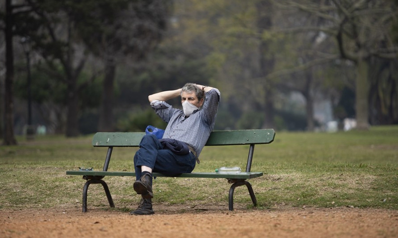 A man wearing a mask sits on a bench at a park in Buenos Aires, Argentina, Aug. 5, 2020. (Photo by Martin Zabala/Xinhua)
