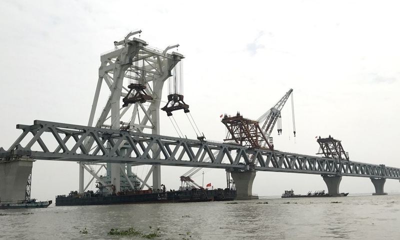 A span is being installed on pillars of the Padma Bridge in Munshiganj on the outskirts of Dhaka, Bangladesh, on Oct. 19, 2020. (Xinhua)