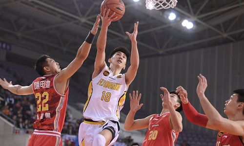 He Jingjia of the Beijing Flying Dragons goes for the basket in their Chinese Basketball Association game against the Bayi Rockets on Sunday in Beijing. The Flying Dragons won 87-84. Photo: CFP