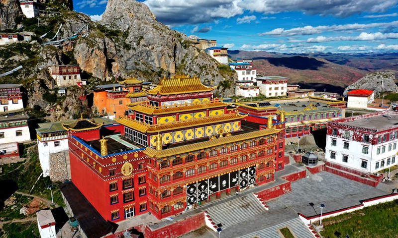 Aerial photo taken on Sept. 19, 2020 shows a buddhist temple at Dengqen County in Qamdo City, southwest China's Tibet Autonomous Region. (Xinhua/Zhan Yan)