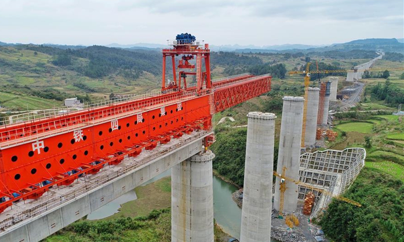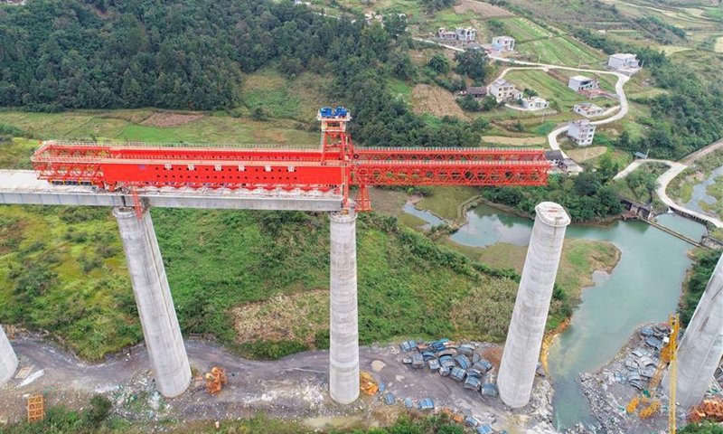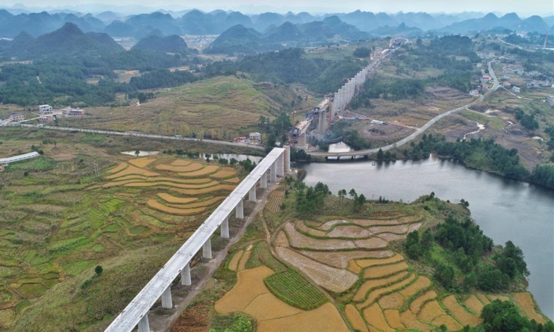 Aerial photo shows the construction of Yinpo River grand bridge of Guiyang-Nanning high-speed railway, in Dushan County, southwest China's Guizhou Province, Oct. 20, 2020. Guiyang-Nanning high-speed railway is designed with a maximum speed of 350 km per hour. (Xinhua/Liu Xu)