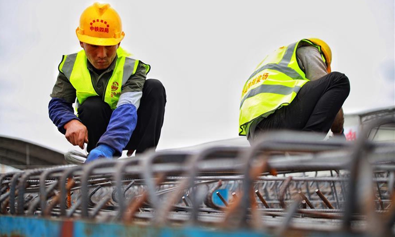 People work at a girder factory in Dushan County, southwest China's Guizhou Province, Oct. 20, 2020. Guiyang-Nanning high-speed railway is designed with a maximum speed of 350 km per hour. (Xinhua/Liu Xu)