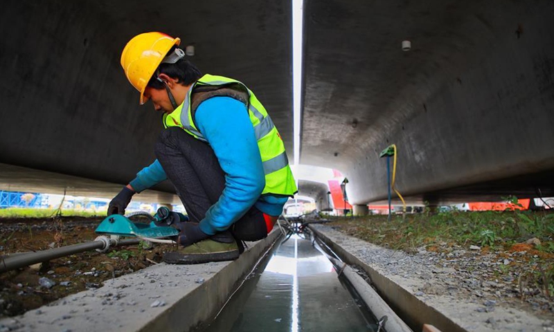 A man works at a girder factory in Dushan County, southwest China's Guizhou Province, Oct. 20, 2020. Guiyang-Nanning high-speed railway is designed with a maximum speed of 350 km per hour. (Xinhua/Liu Xu)