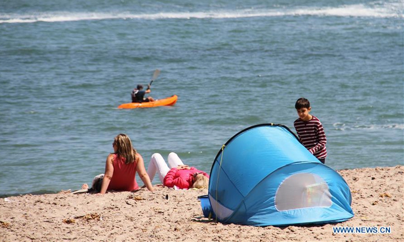 Tourists enjoy their leisure time on the beach in Namibia's coastal town of Swakopmund on Oct. 17, 2020. Namibia implemented Tourism Revival Initiative from September. (Xinhua/Wu Changwei)