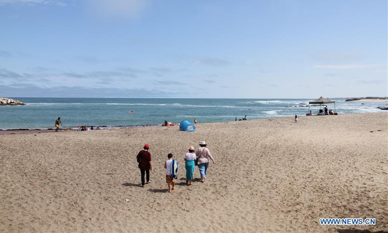 Tourists visit the beach in Namibia's coastal town of Swakopmund on Oct. 17, 2020. Namibia implemented Tourism Revival Initiative from September. (Xinhua/Wu Changwei)