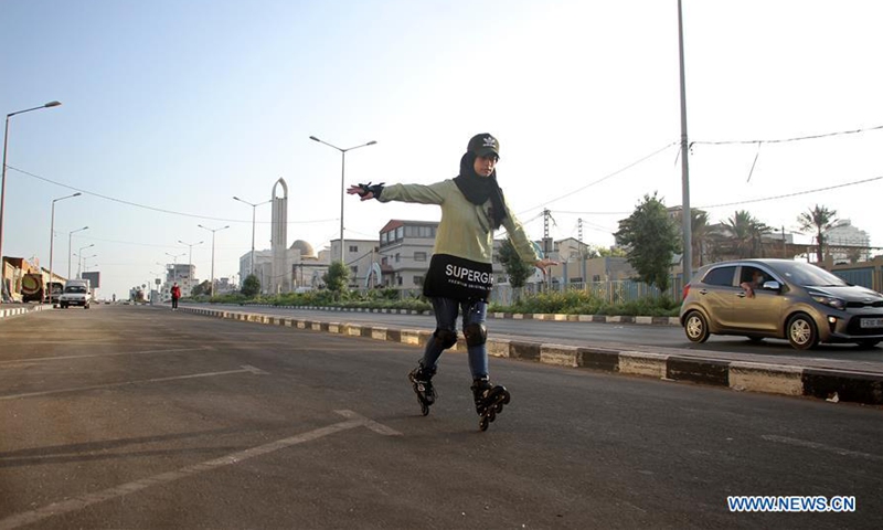 Palestinian girl Marah Hassouneh roller-skates on a street in Gaza City, on Oct. 20, 2020. (Photo by Rizek Abdeljawad/Xinhua)