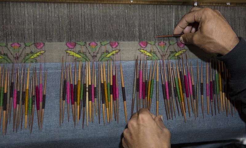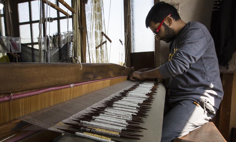 An Artisan weaves Kani shawl, woven from Pashmina yarn, at Kanihama Village of Budgam district, about 40 km west of Srinagar city, the summer capital of Indian-controlled Kashmir, Oct. 20, 2020. (Xinhua/Javed Dar)
