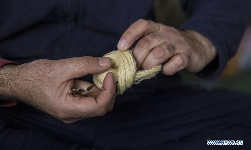 An Artisan prepares threads for the weaving of Kani shawl, woven from Pashmina yarn, at Kanihama Village of Budgam district, about 40 km west of Srinagar city, the summer capital of Indian-controlled Kashmir, Oct. 20, 2020. (Xinhua/Javed Dar)
