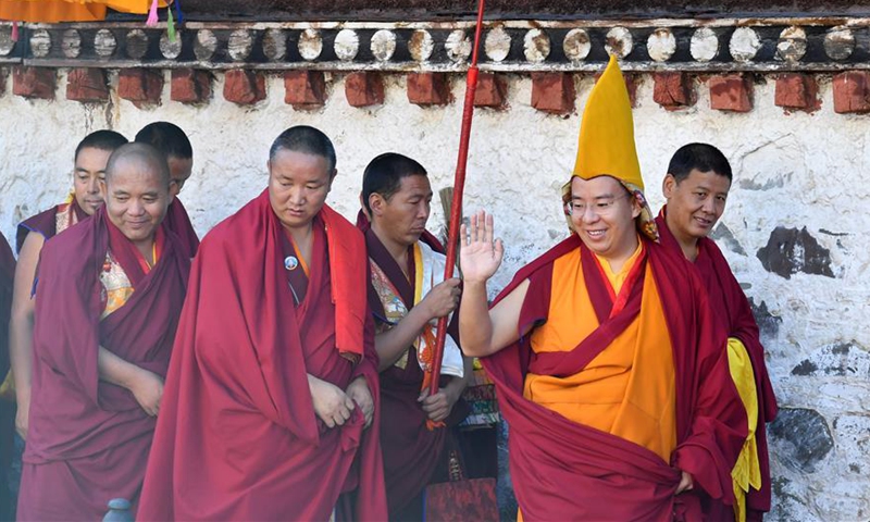 The 11th Panchen Lama, Bainqen Erdini Qoigyijabu, also a member of the Standing Committee of the National Committee of the Chinese People's Political Consultative Conference, vice president of the Buddhist Association of China and president of the association's Tibet branch, waves to the crowd at the Tashilhunpo Monastery in Xigaze, southwest China's Tibet Autonomous Region, Sept. 16, 2020. The 11th Panchen Lama on Oct. 20 completed a tour of southwest China's Tibet Autonomous Region lasting almost three months, during which he performed Buddhist rituals and social activities. (Xinhua/Chogo)