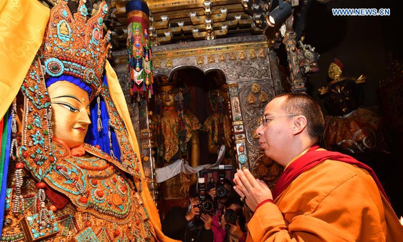 The 11th Panchen Lama, Bainqen Erdini Qoigyijabu, also a member of the Standing Committee of the National Committee of the Chinese People's Political Consultative Conference, vice president of the Buddhist Association of China and president of the association's Tibet branch, visits Jokhang Temple, the most revered monastery in Lhasa, southwest China's Tibet Autonomous Region, Aug. 3, 2020. The 11th Panchen Lama on Oct. 20 completed a tour of southwest China's Tibet Autonomous Region lasting almost three months, during which he performed Buddhist rituals and social activities. (Xinhua/Chogo)