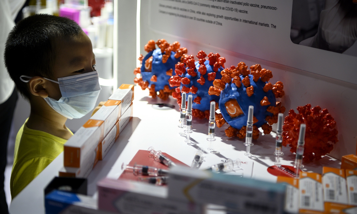 A boy looks at Sinovac Biotech LTD's vaccine candidate for COVID-19 on display at the China International Fair for Trade in Services (CIFTIS) in Beijing. Photo: AFP