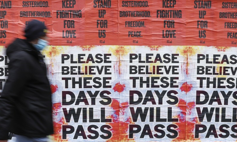 A man walks past posters encouraging people to have faith during the coronavirus outbreak in London, Britain on April 30, 2020.Photo:Xinhua