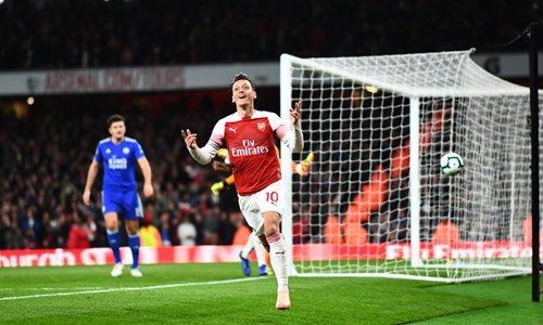 Mesut Ozil of Arsenal celebrates scoring against Leicester on Monday in London, England. Photo: IC