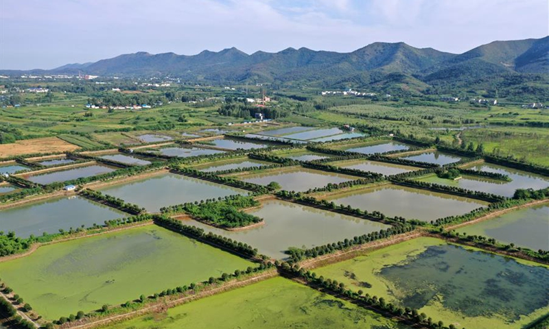 Aerial photo taken on Aug. 25, 2020 shows the fields of a crab cultivation base at Madeng Town of Xichuan County in Nanyang, central China's Henan Province. As part of the water source of the middle route of China's south-to-north water diversion project, Xichuan County has made much progress in both ecological protection and poverty alleviation.Photo:Xinhua