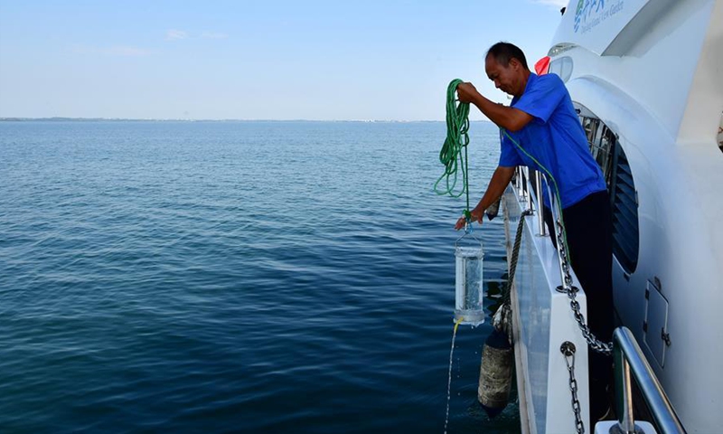 A worker gets water from Danjiangkou reservoir to share with tourists at Xichuan County in Nanyang, central China's Henan Province, Aug. 26, 2020. As part of the water source of the middle route of China's south-to-north water diversion project, Xichuan County has made much progress in both ecological protection and poverty alleviation.Photo:Xinhua