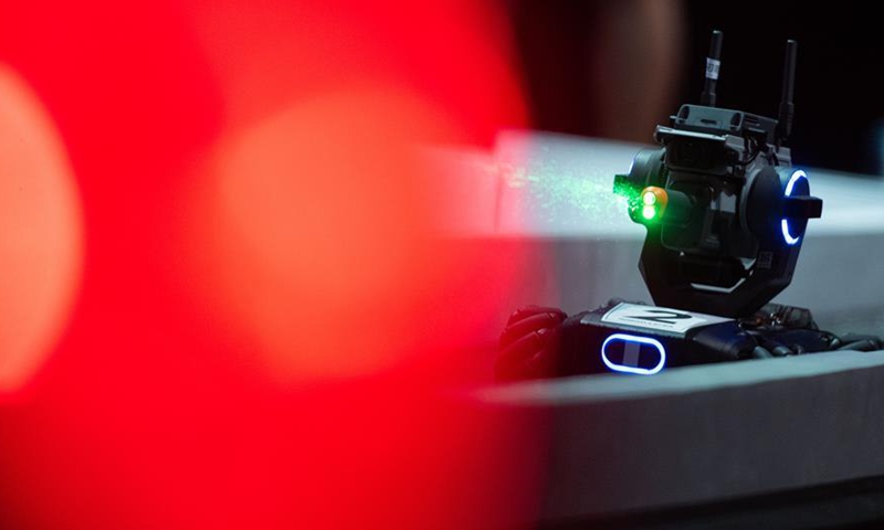 Photo taken on Oct. 21, 2020 shows a robot controlled by a contestant during the RoboMaster 2020 Youth Tournament in Macao, south China. A total of 18 teams from 10 middle schools participated in the robotics competition here on Wednesday. Photo:Xinhua