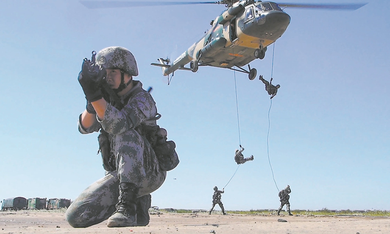 A soldier provides security as his fellows fast-rope from a transport helicopter attached to an army aviation brigade under the PLA 81st Group Army during a recent real combat training exercise near the Bohai Bay.Photo:China Military