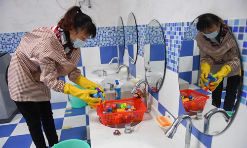 A staff member disinfects toys at a kindergarten in Changsha, central China's Hunan Province. (Xinhua/Chen Zeguo)