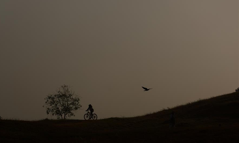 A cyclist is pictured on a foggy morning in Lalitpur, Nepal on Oct. 22, 2020. (Photo by Sulav Shrestha/Xinhua)