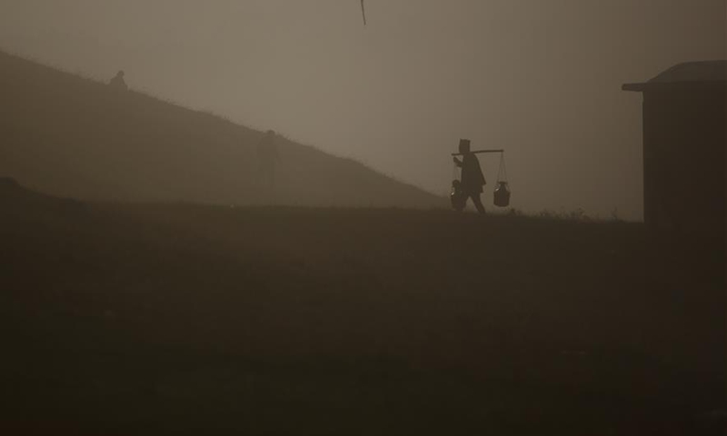 A man carrying a shoulder pole is pictured on a foggy morning in Lalitpur, Nepal on Oct. 22, 2020. (Photo by Sulav Shrestha/Xinhua)